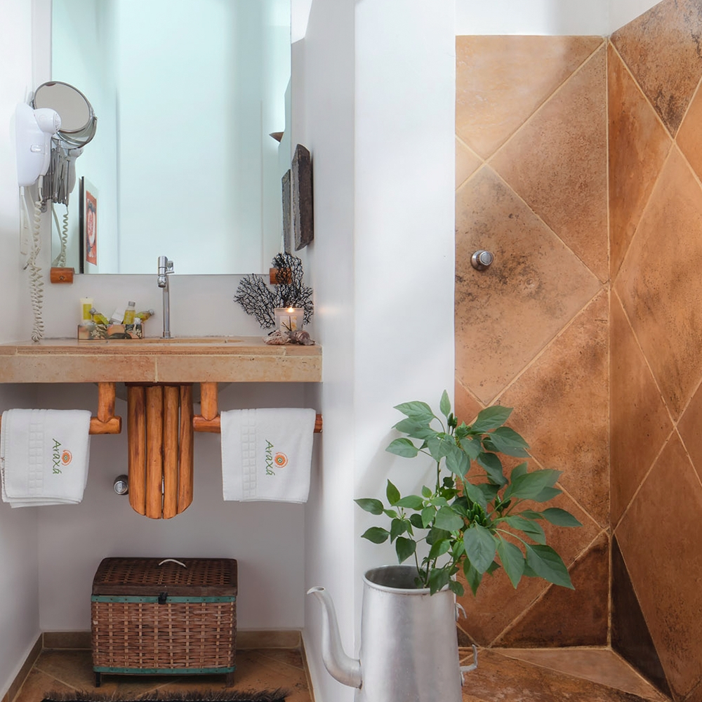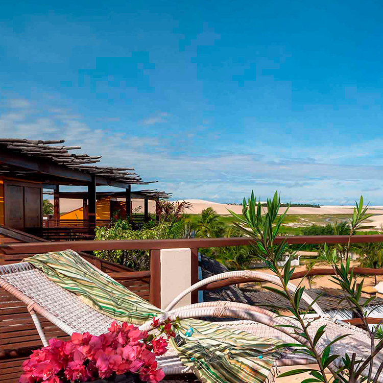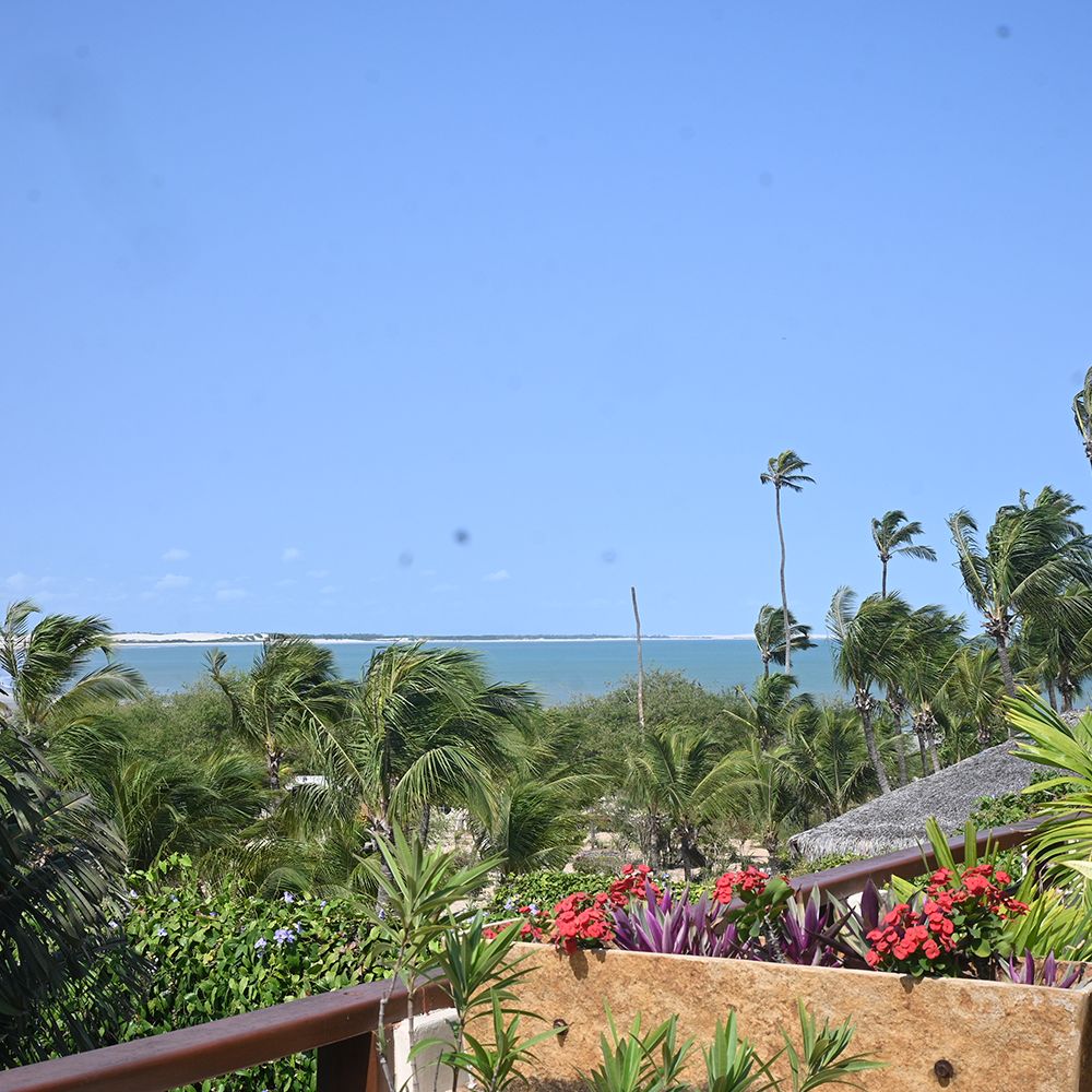 Localizada no andar superior, possui uma pequena sacada com vista para o jardim e piscina, e terraço privativo com vista panorâmica da vila, dunas e mar.